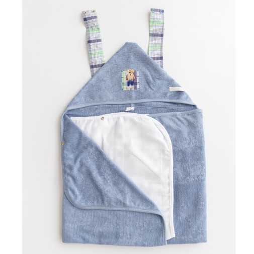 Toalha Multifuncional com malha atoalhada dupla e com fralda solta presa com botão. Alças para pendurar no pescoço com botões para soltar.