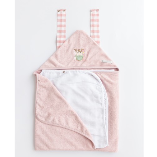 Toalha Multifuncional com malha atoalhada dupla e com fralda solta presa com botão. Alças para pendurar no pescoço com botões para soltar.